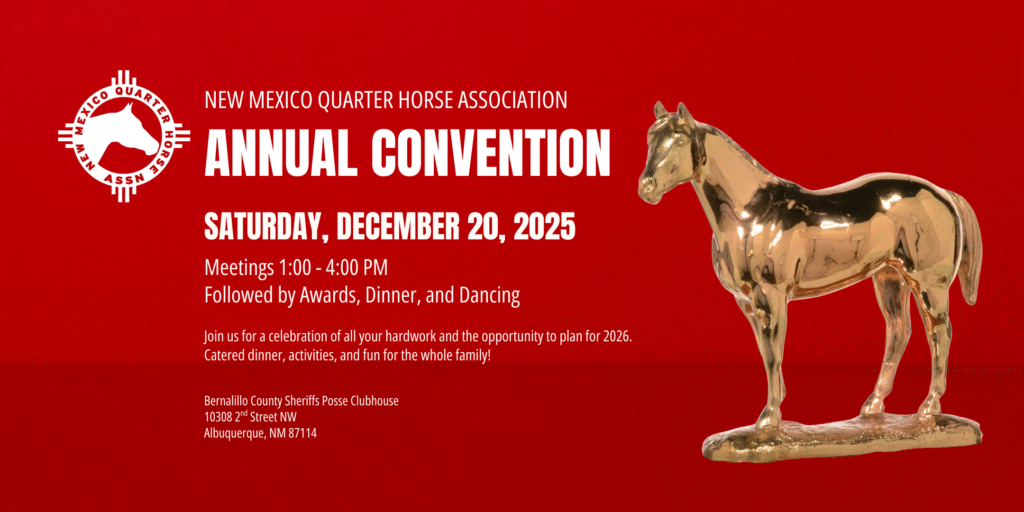 The annual NMQHA Convention and Awards Dinner is scheduled for Saturday, December 20 at the Bernalillo County Sheriffs Posse Clubhouse. There will be a catered dinner, awards ceremony, dancing, and activities for the whole family. Free to attend. RSVP here or click the image below.