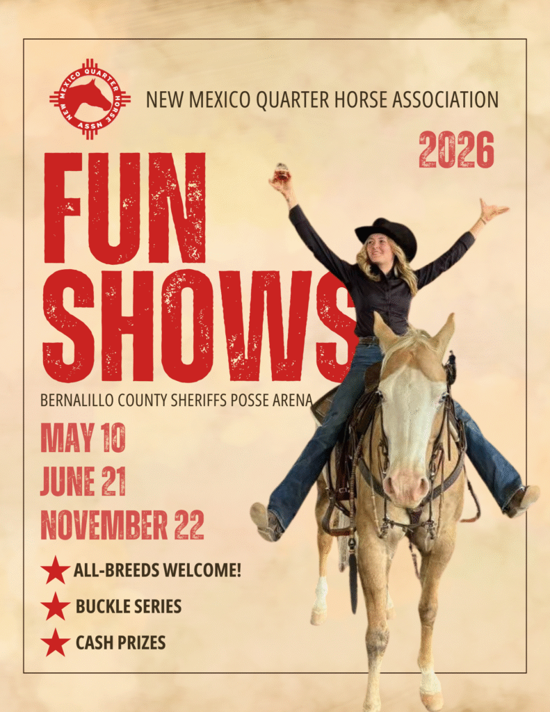 NMQHA’s fourth annual Buckle Series of three All-Breed Fun Shows will be May 10, June 21, and November 22, 2026 at the Bernalillo County Sheriff’s Posse Arena. Exhibitors who join NMQHA as members and participate in at least two of the three fun shows are eligible for buckles and other awards.