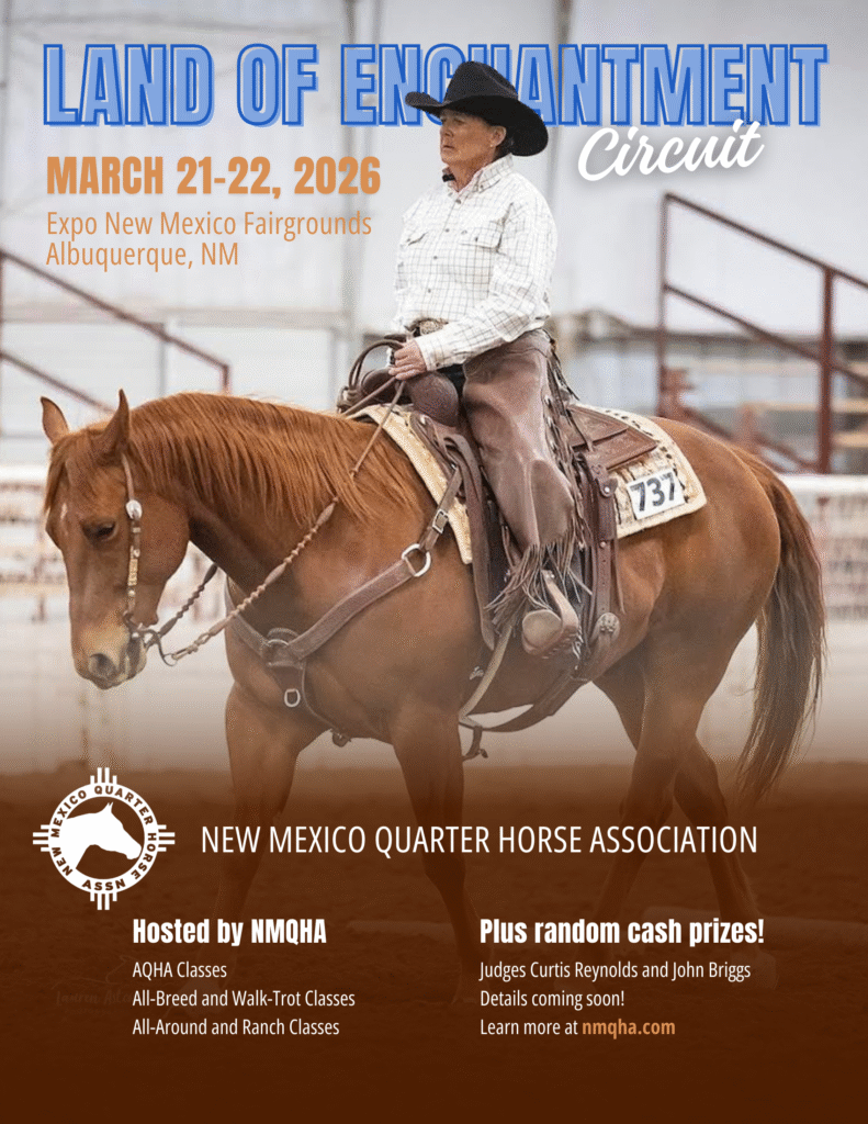 NMQHA is back to hosting the 2026 Land of Enchantment show at EXPO New Mexico. Join us on March 21-22, 2026 for a double-judged AQHA show with ranch, all-around, and all-breed classes. Judges will be Curtis Reynolds and John Briggs. Membership forms and sponsorship forms can be found on the ABOUT page.