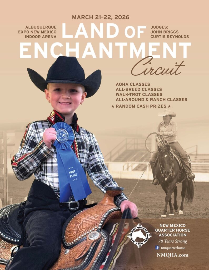 NMQHA is back to hosting the 2026 Land of Enchantment show at EXPO New Mexico. Join us on March 21-22, 2026 for a double-judged AQHA show with ranch, all-around, and all-breed classes. Judges will be Curtis Reynolds and John Briggs. This show is family-friendly and for exhibitors of all ages. Enjoy cool awards, random cash prizes, and free lunch for exhibitors sponsored by Dion’s and the Range Cafe.